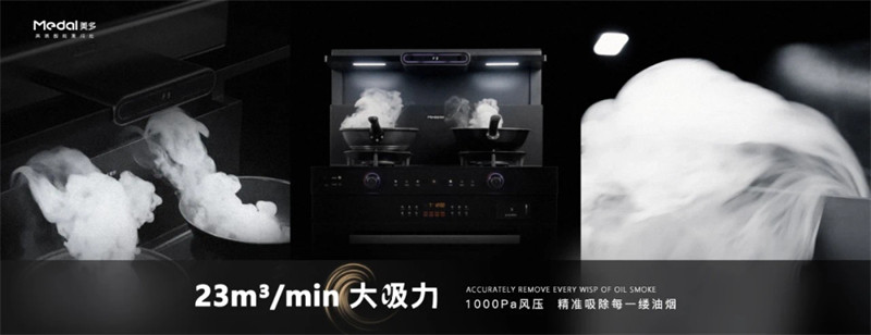 "一秒清场“的超能力,只有优秀的“厨电精英”才会拥有。美多语音分蒸烤集成灶新品F16M采用了全新的侧吸下排吸烟技术, 23m³/min的持久强劲大吸力,1000pa静压,精准吸除每一缕油烟,下厨高峰期也无惧油烟倒灌。烟灶联动与低空近吸的最强拍档,不放过一丝“漏网之鱼”。